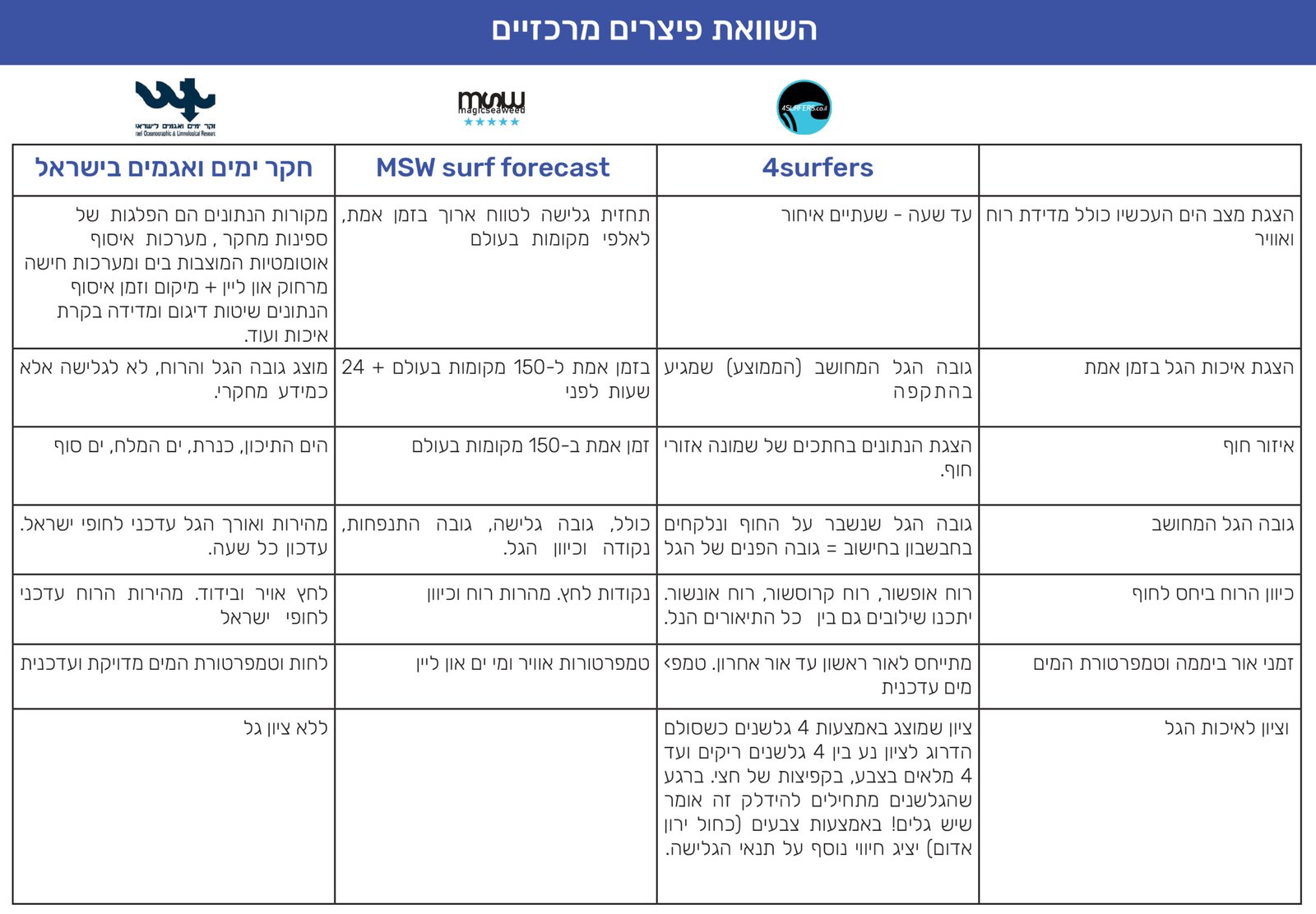 לצורך כך, נערך מחקר ב-3 אתרים/אפליקציות מובילים מתחום הים לצורך השגת המידע. והמידעים על מצב הים ואיכות הגל בישראל נבדקו בזמן אמת. נערכה השוואה בין המקורות השונים כמפורט: 1. אתר ישראלי: "חקר ימים ואגמים בישראל", 2. אפליקציית 4surfers, ו- 3. אפליקצייה/אתר עולמי MSW surf forecast.